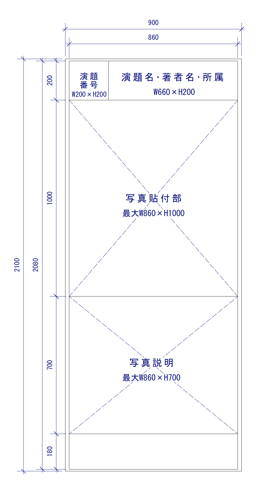 縦200mm×横660mmのサイズに演題名、著作名、所属を記入したものを各自でご用意ください。